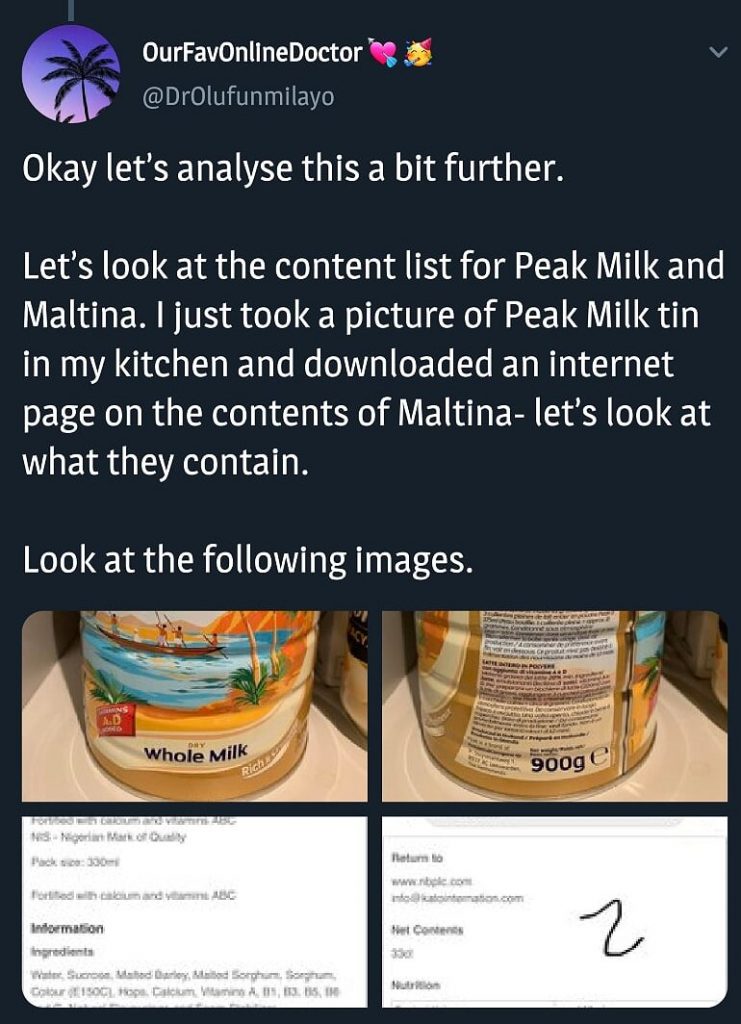 “Okay let’s analyse this a bit further. Let’s look at the content list for Peak Milk and Maltina. I just took a picture of Peak Milk tin in my kitchen and downloaded an internet page on the contents of Maltina- let’s look at what they contain. Look at the following images.